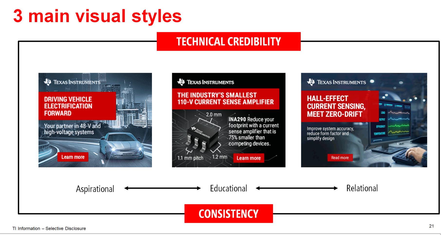 During my time at Texas Instruments, I led a rebranding effort as Director of Content, Channels and Creative. Under my leadership, my 25-member team of FT employees and contractors reinvented the look and feel of the brand with a focus on custom lab photography and leaning into the company’s passion. We hired an external agency to do the branding for our brand campaign, but ultimately, we didn’t select any of their options, and instead, I came up with the campaign umbrella, Engineering Progress - which TI is still using today, 5 years after I left. My involvement in this campaign was soup to nuts - I conceptualized and planned photo shoots, edited all final copy, led related blog and social content development, and thereby touched off several multi-million dollar marketing campaigns. I also personally wrote the company’s brand guidelines, researched and rewrote the company’s values, authored the About TI pages, and wrote and produced 8+ new brand videos under the Engineering Progress umbrella.